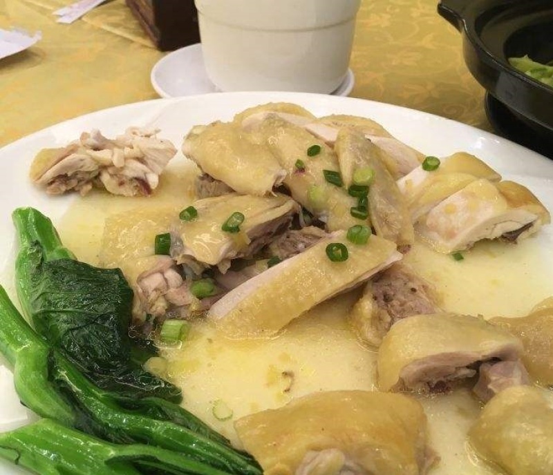 制作食材: 肥光鸡1只,750克、葱白25克、姜茸25克、精盐10克、味精3克、郊菜400克、汾酒15克、麻油10克、生粉10克 制作方法: 1.将鸡洗净,晾干。把葱白、姜茸、味精、精盐、汾酒搅匀,遍涂鸡身,剩下的全部放进鸡腔内,把鸡放在碟中,隔水用猛火把鸡蒸熟。 2.将熟鸡斩件砌在碟中。另起镬,将郊菜炒熟,拌在已斩好的熟鸡旁边。 3.另起镬,倒上原汁,打芡,加上麻油推匀,把汁淋在斩好的鸡上。