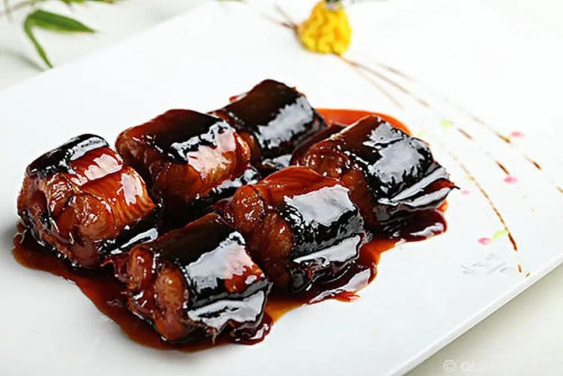 个说法,宁波菜中✲✲能检验大厨师傅的功力高低的就是这道菜。做这道菜需要用本塘河鳗去掉内脏,蒸的烂熟,这时富含脂肪的鳗皮已呈半透明蝉翼状,要将鳗体之骨剔出已相当的困难,但殊不知这只是本菜的一半之功,更难的是将熟鳗再放到锅内红烧,而那吹弹可破的鳗皮却不能有半点的斑疤伤痕。 【原料】活河鳗2条(净肉约重750克),生猪板油丁25克,生笋75克,小葱100克,姜块10克,桂皮5克,白糖25克,黄酒10克,红酱油30克,醋15克,芝麻油5克,熟猪油5克,生油50克。 【制法】 1、先将河鳗用剪刀在胸鳍处和肛门处各剪一刀,将大骨剪断,皮肉仍要相连,放净血,放入木桶里,加热水泡皮,然后再把它放入冷水中,抹去鳗身上白色粘液,再用两只竹筷从咽喉部插入腹中,一手捏住鳗身,一手捏紧筷,顺一个方面绞卷几下,把肠子等一起拉出洗净,斩去头尾,切成6厘米长的段,(只切断大骨,皮肉仍要相连哦)。 2、取扣碗一只,将切好的河鳗顺序地圈在扣碗里,加入葱段、姜块、黄酒、生笋放入笼里用旺火蒸1小时左右,至河鳗酥烂时取出,拣去葱姜后待用。食用时,炒锅下生油25克烧热,再投葱段、姜末、桂皮煸出香味,随即将蒸酥的河鳗连同生猪板油丁一起放入锅里,下黄酒、红酱油、白糖、醋、熟猪油、白汤250克,加盖用小火烧10分钟左右,见汤汁稠浓,洒上生油25克,端锅转动几下,再淋上芝麻油装盆即成。 3、制作此菜,选料严格,宜取冬季背黑、肚白、嘴小、头大,重约650克一条的河鳗为佳。烧制时要准确选择火候,使河鳗酥而不烂,皮身完整不破。活河鳗2条(净肉约重750克),生猪板油丁25克,葱结40克,姜片25克,葱段60克,白糖75克,黄酒30克,红酱油40克,味精1克,麻油5克,生油50克。