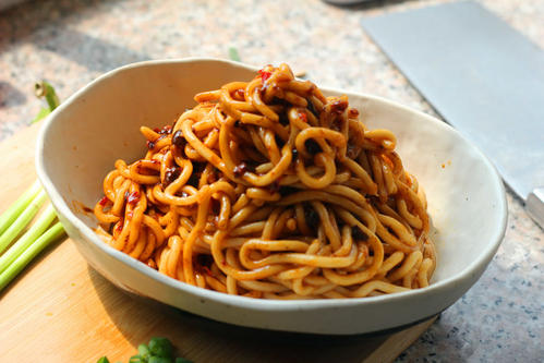 7、花生酱拌面 食材:挂面100克、花生酱20克 、生抽1汤匙、 老抽1茶匙、 花生油1汤匙 、开水50毫升、 葱花少许。 做法: 1.挂面煮软捞出(各种细面都行)。 2.将花生酱、生抽、老抽、花生油用开水调匀。 3.放入煮好的面,撒葱花,拌匀即食。超香~~ 8、武汉热干面 食材:水切面500克、香葱适量、酱萝卜条适量 、白胡椒适量 、芝麻酱3大勺 、芝麻香油5大勺 、香醋1大勺 、酱油2大勺 、白砂糖1大勺 、辣椒油适量 、卤牛肉汁6大勺 、食用油2大勺。 做法: 1.将萝卜条切丁、香葱切末,芝麻酱用香油慢慢调开后加入酱油、白砂糖、香醋、白胡椒调匀。 2.将水切面抖散,拌入2大勺食用油,放入蒸屉,大火蒸20分钟左右,每隔几分钟翻动一下面条,面条9分熟。 3.蒸好的面条拌一点香油晾凉,盖保鲜膜冷藏过夜。 4.大火烧开锅里的水,放入处理过的水切面,煮1分钟,面条控干水分放入碗中,拌入之前调制的调料就可以啦。